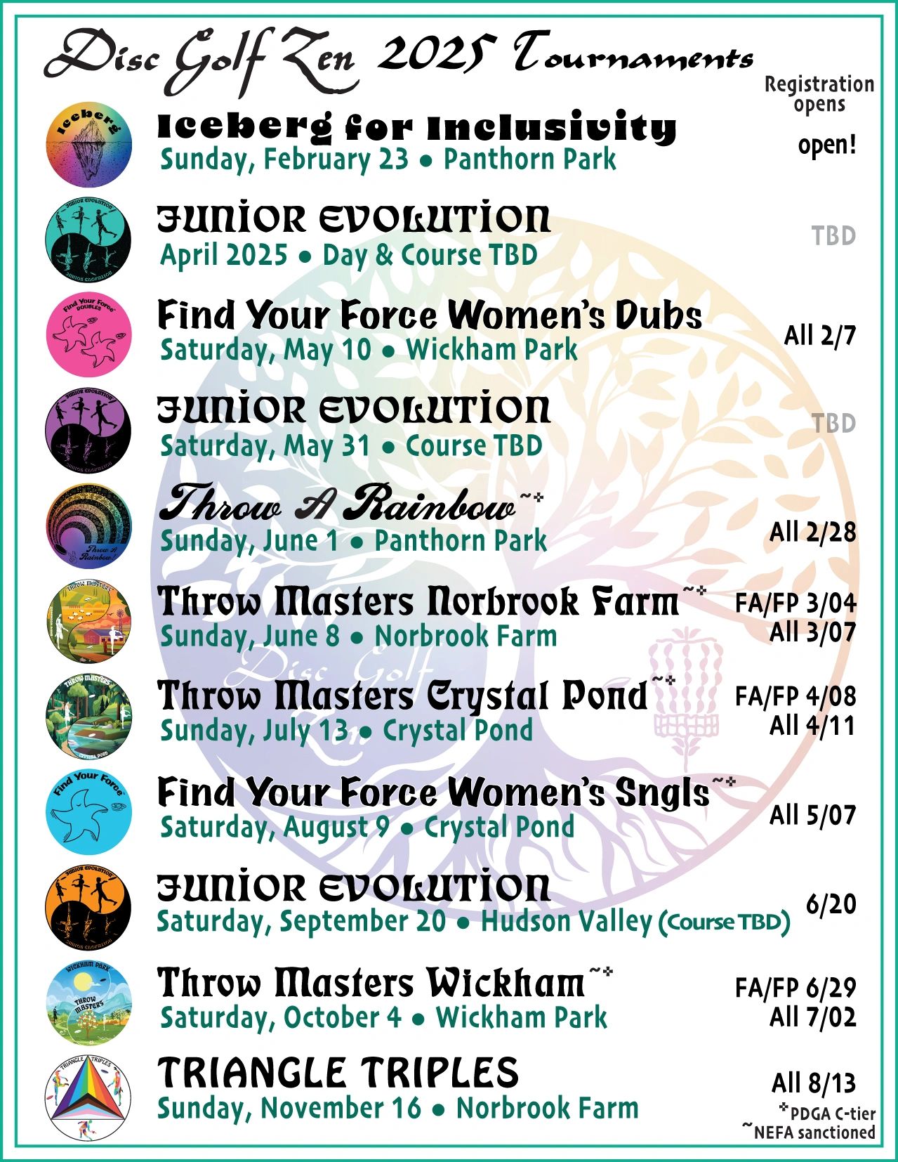 Find Your Force (Women’s doubles and singles) , Throw Masters (age 40+), Junior Evolution (Juniors), Iceberg for Inclusivity, Throw A Rainbow, Triangle Triples (Triples) and All About Birdies (Glow) give everyone an opportunity to play and "compete".